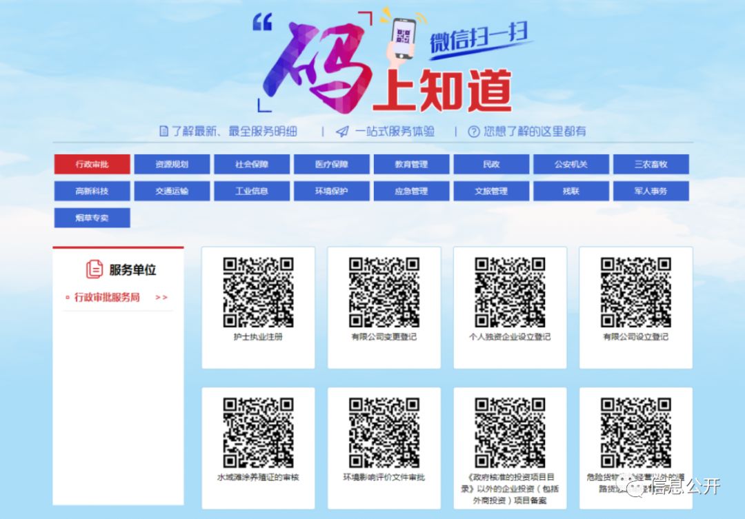 体验区将进驻政务服务中心的每个审批服务事项分解成“二维码”将资源集中上传,通过电脑、触摸屏等终端集中展示,办事群众和企业通过扫描“二维码”图标,获取服务事项的办理依据、办理时限、所需要件等相关信息,实现一次性告知服务由口头告知、书面告知转为电子信息告知,最大程度方便企业和群众,免去印刷张贴的复杂流程,且可以随时更新,绿色环保。