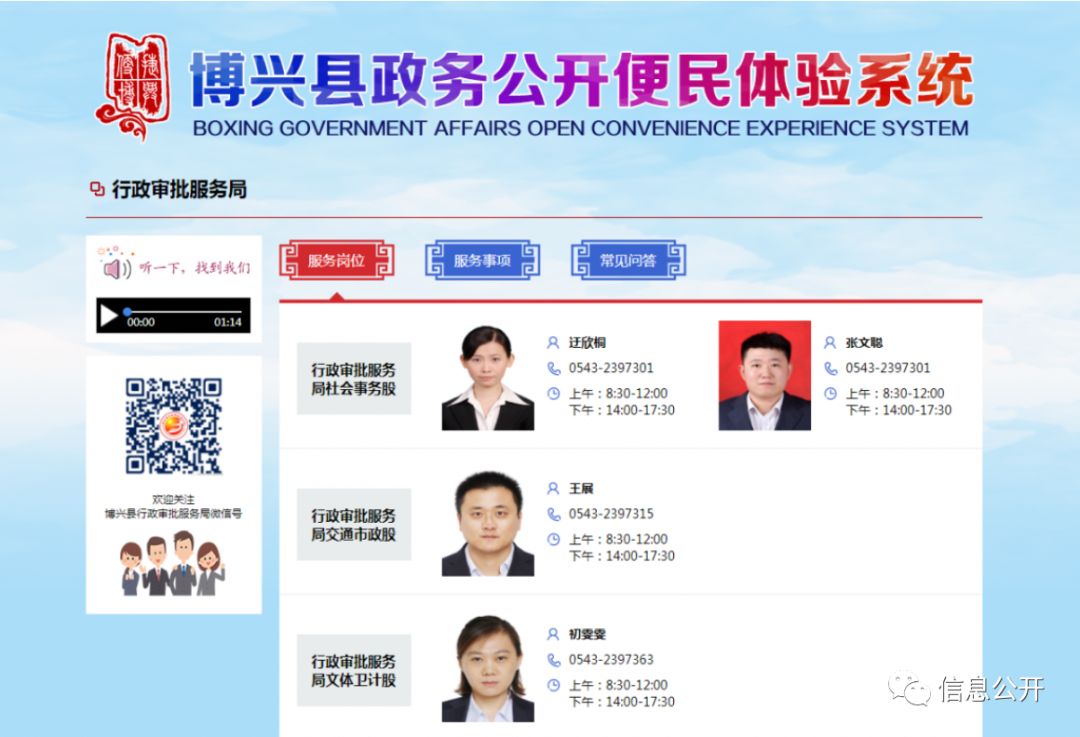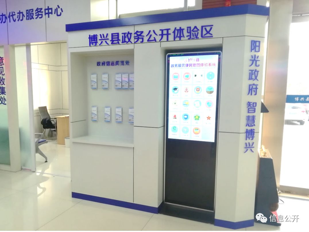 关注↑↑↑我们获得更多精彩内容!为全面落实党中央、国务院和省市关于“放管服”改革部署和全面推进政务公开决策部署,坚持公开是常态、不公开是例外,切实加大政务公开工作力度,加强政务公开惠民便民服务,围绕公众普遍需求和重点民生事项,解决百姓办事过程中门难找、事难办及办事流程繁冗复杂的问题,今年以来,博兴县政府按照《山东省2019年政务公开工作要点》要求,创新了政务公开形式,通过点线面结合、区廊栏并举,在县政务服务大厅试点打造了2处集信息公开、服务展示、查阅获取于一体的政务公开体验区。体验区为公众提供导购式、指引式信息服务,打通了服务群众“最后一公里”。